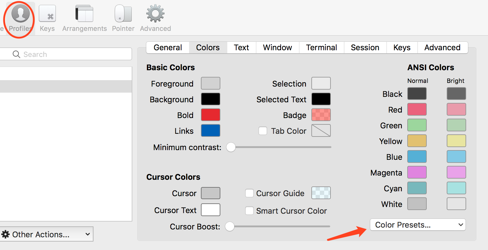 默认启动的时候,iTerms 是没有任何配色方案的,通过下面的步骤,启动 iTerms 的配色方案,