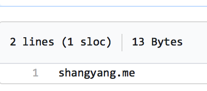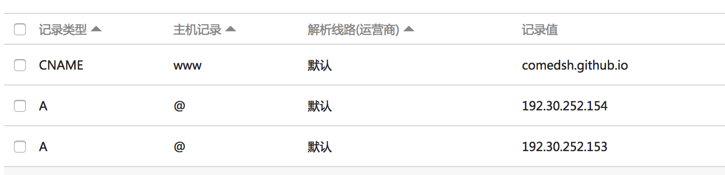 两条 A 记录,一条 CNAME 记录,这样,就可以将 shangyang.me 域名映射到 comedsh.github.io 上面了;为什么需要输入上述两条 A 记录,参考官方解释 https://help.github.com/articles/setting-up-an-apex-domain/#configuring-a-records-with-your-dns-provider