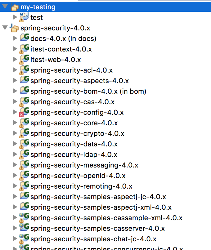 Spring Security 中的源码工程众多,而且不是严格按照 parent-child 的工程模式创建的;最佳实践便是创建 workingset 将自己的测试工程与 Spring Security 的源码工程分割开来;