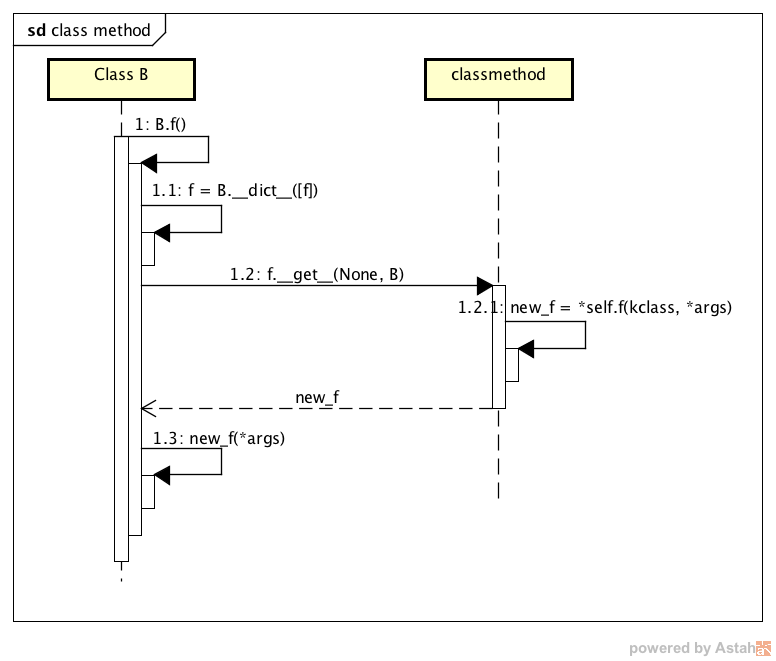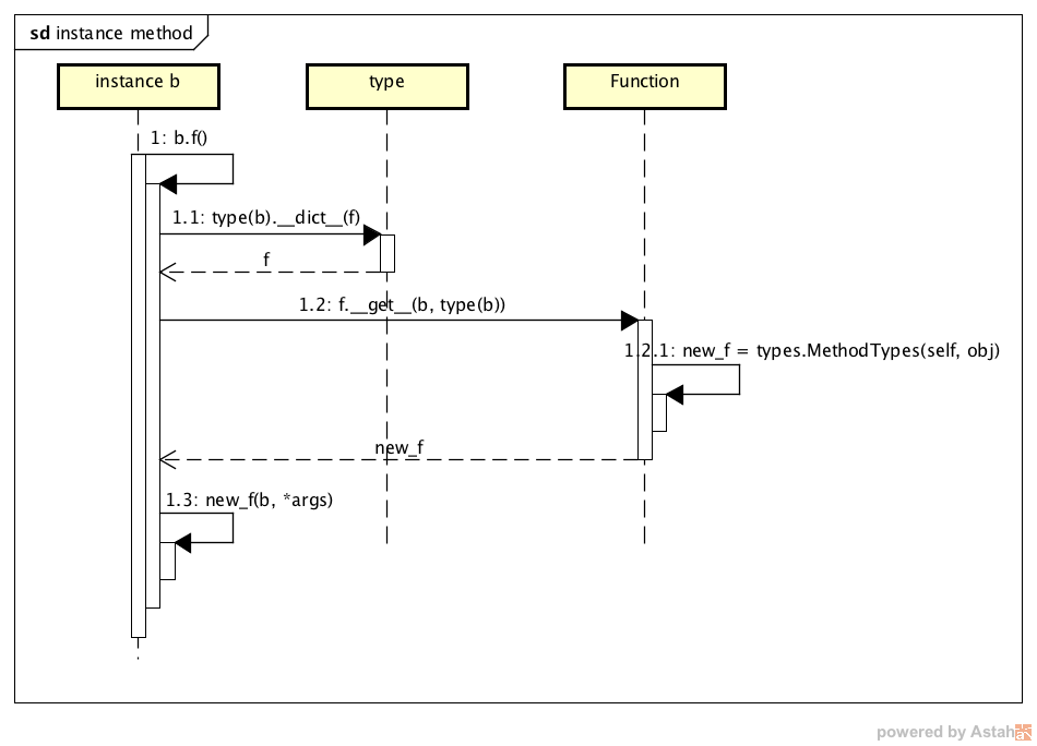 注意的是,这里传递的参数 $b$ 和 $type(b)$ 对应的是其后两个参数;最后通过方法 $types.MethodType(self, obj)$ 构造出一个实例方法 $new\_f$ 的引用并返回,因此,这里的参数 $self$ 指的是 $Function$ 实例本身,而参数 $obj$ 是实例 $b$; - 最后调用 $new\_f(b, *args)$ 以完成该实例方法的调用;