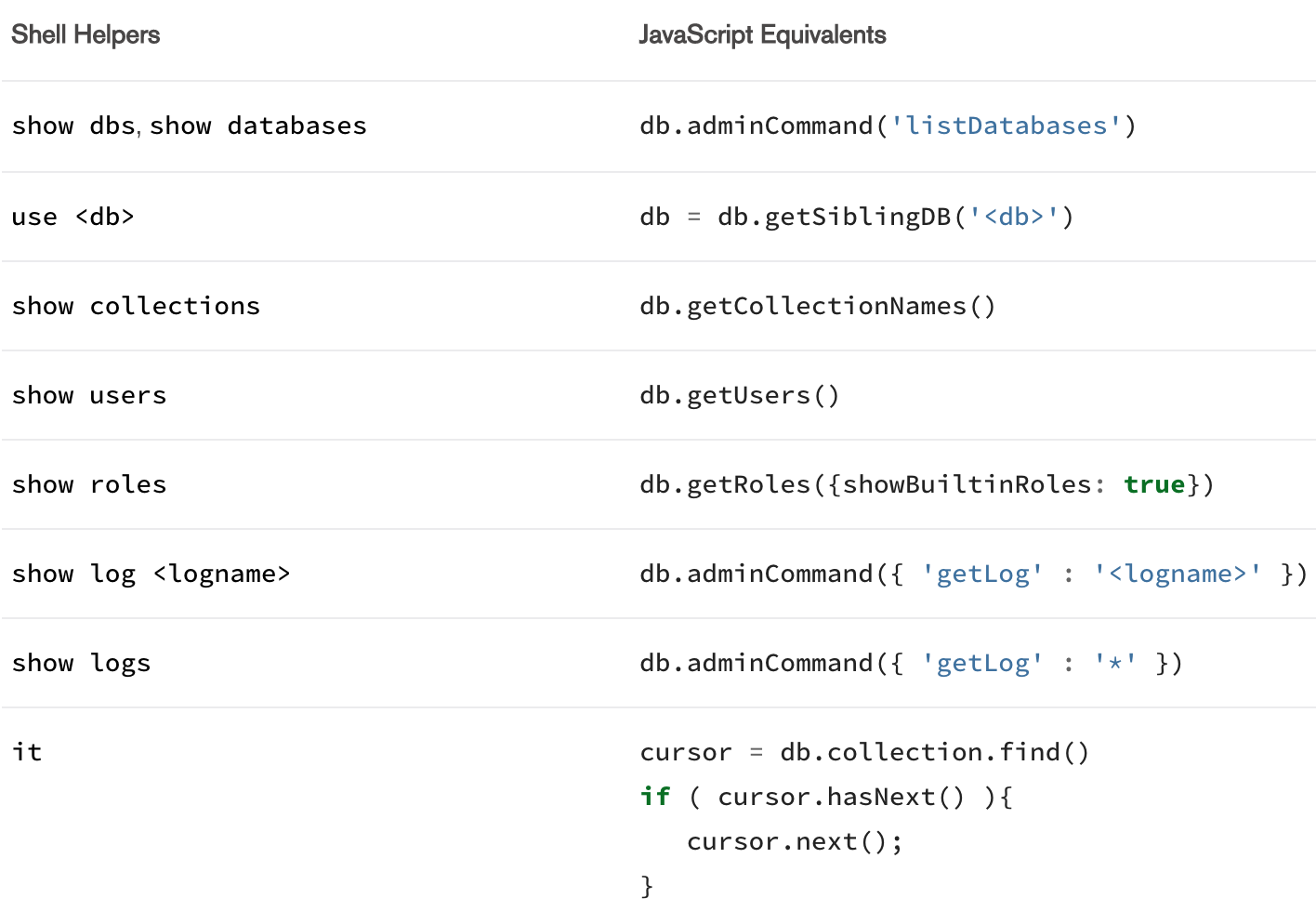 - 不能在 JavaScript 文件中使用任何的 shell helper ( 比如,use <dbname>, show dbs 等等 ),因为他们并不是有效的 JavaScript 方法;如果一定要在 JavaScript 中使用 shell helper 命令,可以使用相关的可替代的方法,