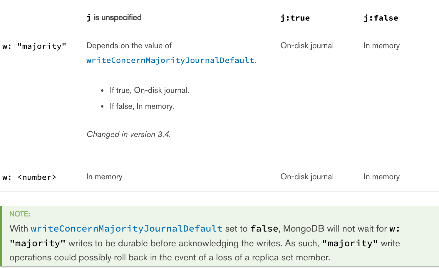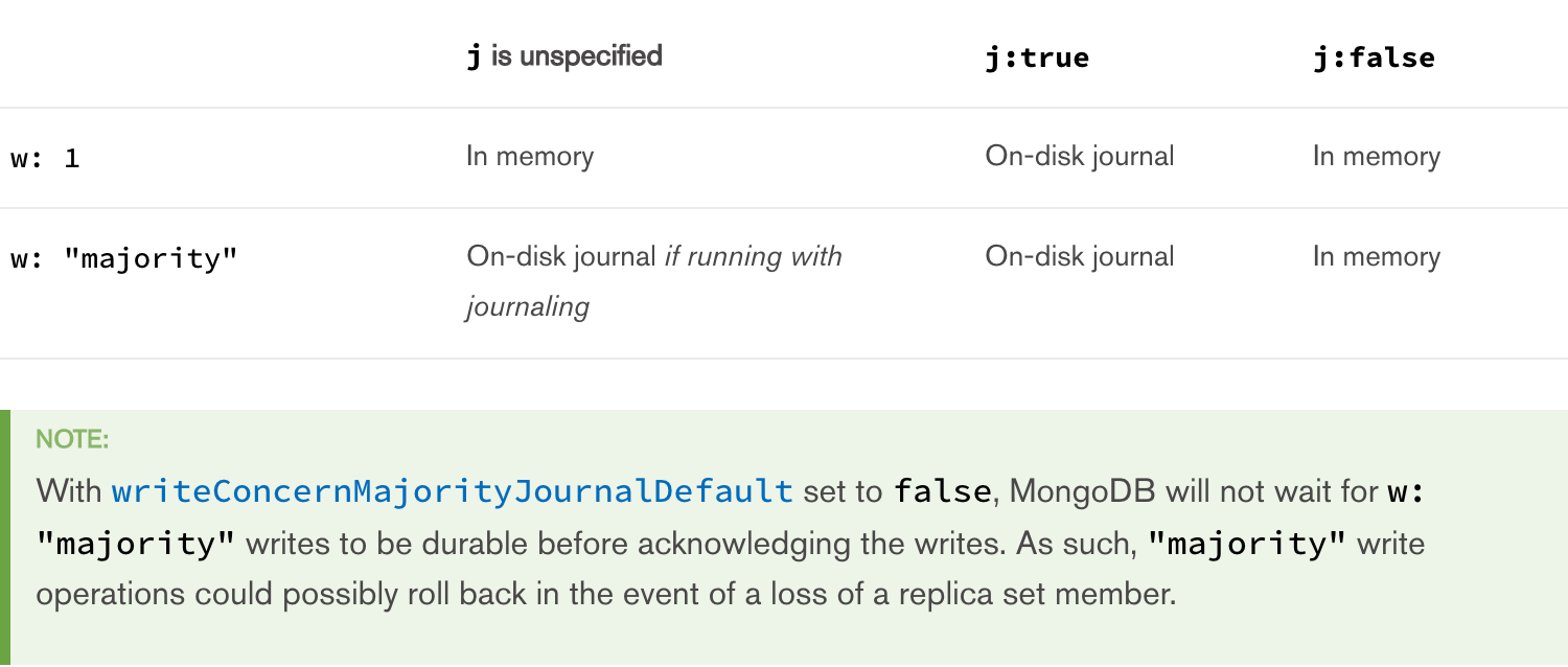 使用单机版的 mongod 的时候,无论写入操作是写入内存还是写入磁盘日志都会响应;下面这张表格描述了根据不同的配置对应的不同的响应行为;