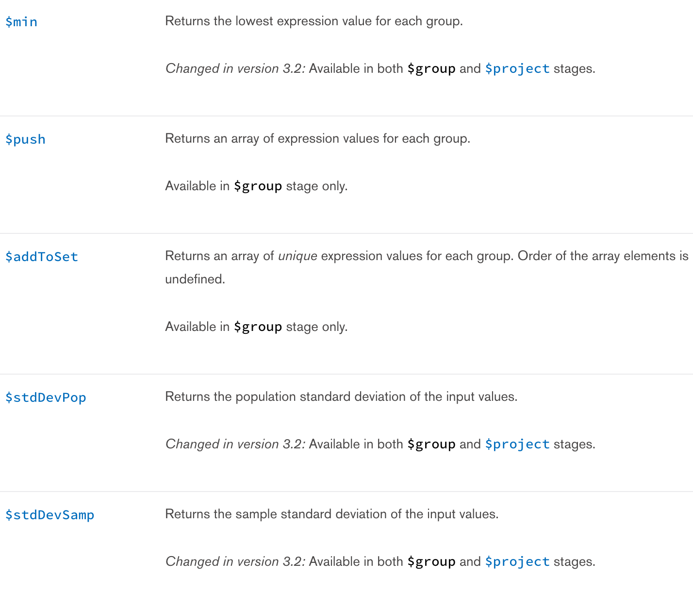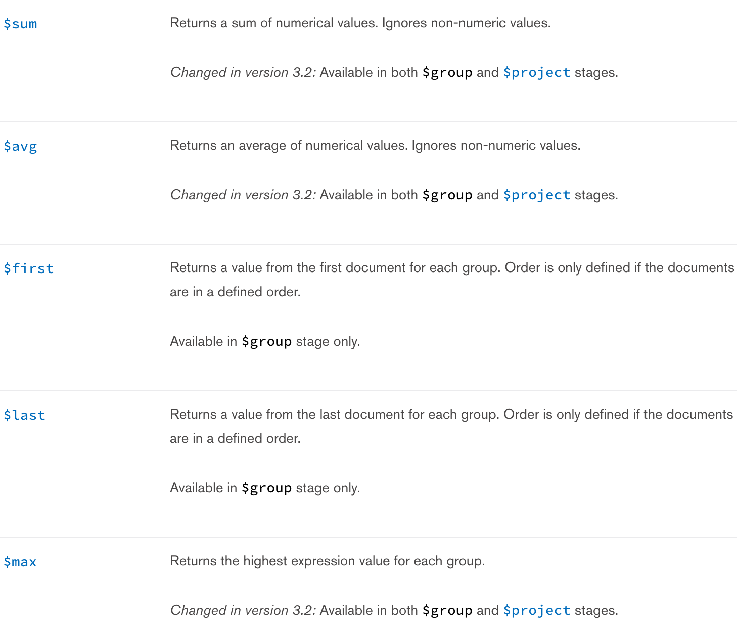 https://docs.mongodb.com/manual/reference/operator/aggregation/#aggregation-accumulator-operators