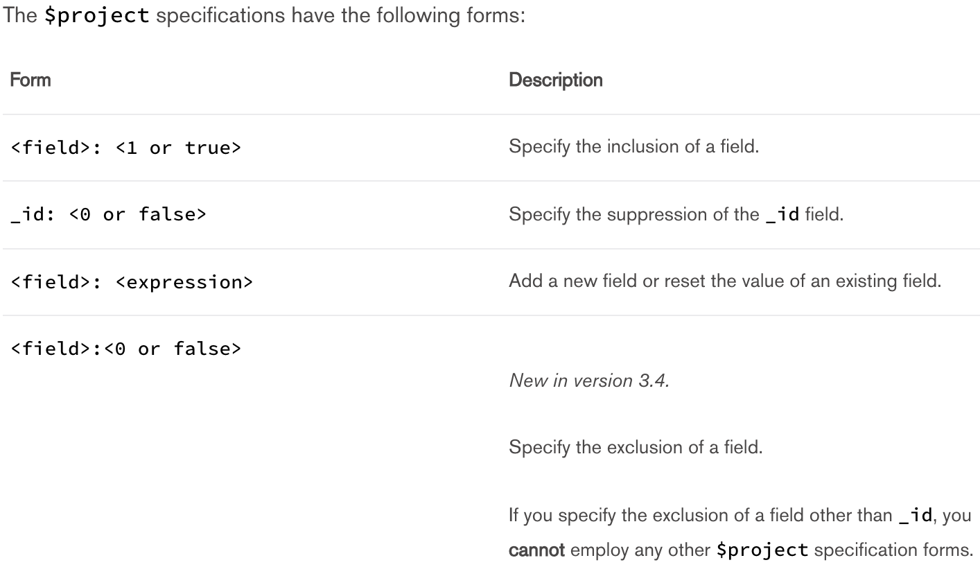 The \$project takes a document that can specify the inclusion of fields, the suppression of the _id field, the addition of new fields, and the resetting of the values of existing fields. Alternatively, you may specify the exclusion of fields.