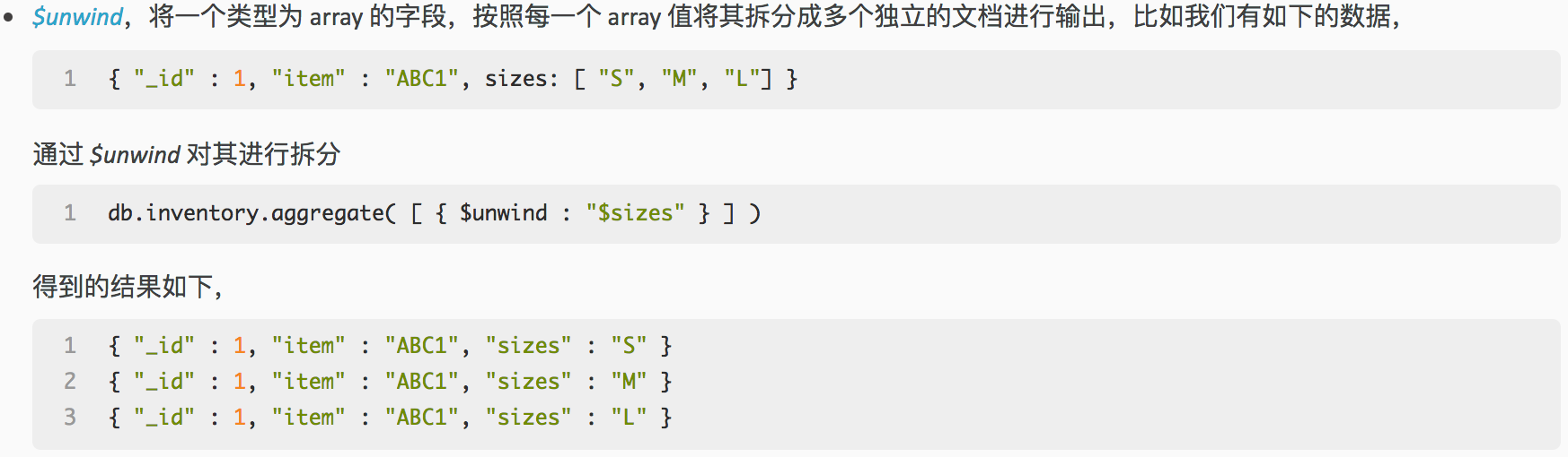 如果 document 的某个字段值是一个 array,那么将该 array 拆分,拆分后,使用 array 中的每一个值与 document 的其余字段单独构成一个 document;